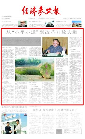 2008年,也是中(zhong)國改革開(kai)放(fang)(fang)(fang)30周年,《經(jing)濟參考報》刊發《從(cong)“小(xiao)(xiao)平小(xiao)(xiao)道”到(dao)改革開(kai)放(fang)(fang)(fang)大道》。當年,受到(dao)錯誤批(pi)判的鄧小(xiao)(xiao)平同志被疏散(san)到(dao)江(jiang)西新建(jian)縣拖拉機廠勞動。在(zai)這條原(yuan)本(ben)不是路、工友們為了讓他不繞遠路而悄悄修整出來的田邊小(xiao)(xiao)路上,鄧小(xiao)(xiao)平徘徊了三(san)年、思考了三(san)年。當鄧小(xiao)(xiao)平重新登上中(zhong)國政治舞臺中(zhong)心的時(shi)候,他帶領全國人(ren)民(min)走上了一(yi)條沒(mei)有(you)前人(ren)經(jing)驗借鑒的改革開(kai)放(fang)(fang)(fang)大道。