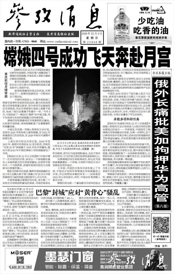 《參考消息》頭版報道嫦娥四號成功發射升空