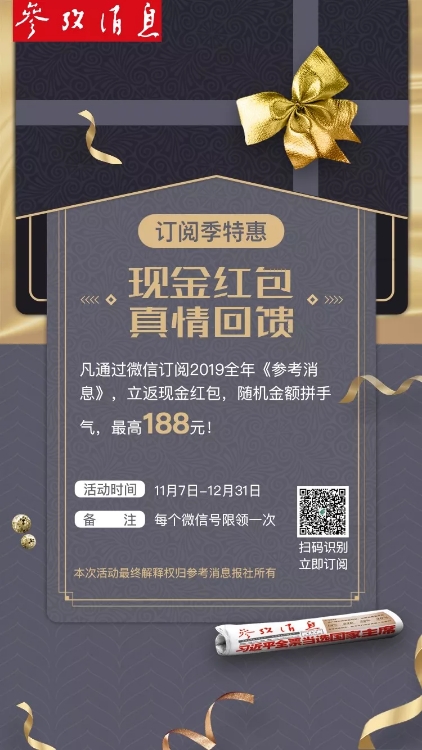 凡通過微信訂閱2019全年《參考消息》,立返現金紅包,隨機金額拼手氣,最高188元!