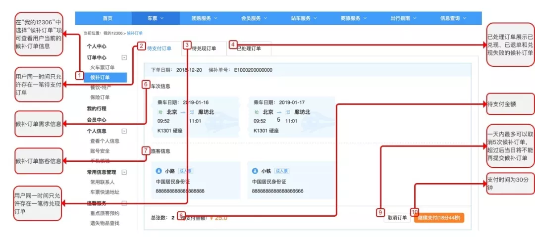 手機APP示意圖 候補訂單提交成功后需在30分鐘內完成支付,完成候補預付款支付后,候補購票訂單立即生效。候補購票訂單生效后,相關候補需求不可修改,如需變更,可終止訂單后重新操作。兌現時,按照候補訂單生效的時間順序,兌現符合條件的候補需求。預付款按該單不同組合需求中票款的最高額度計算(臥鋪按下鋪票價計算)。 候補購票預付款支付成功后,系統將持續嘗試為您兌現候補需求(同一候補需求不進行部分兌現),若有匹配需求的車票,系統將自動為您生成已支付訂單,預付款大于實際票款的,系統將自動退回差額票款;若無匹配需求的車票,系統將在截止兌現時間自動終止兌現,用戶主動終止或系統自動終止候補的,系統自動全額退還預付款。 兌現成功或自動終止時,將通過您選擇的通知方式進行告知,請注意查收消息并關注“候補訂單”兌現狀態。兌現成功車票視為已購車票,退改簽按既有規則辦理。 劃重點 候補訂單提交成功后 需要在30分鐘內完成支付 預付款按組合需求中票款最高額度計算 系統自動退回差額票款 登錄12306.cn網站,在個人中心導航欄上點擊“候補訂單”可進入訂單查看頁,候補訂單分為“待支付訂單”、“待兌現訂單”和“已處理訂單”三個選項,其中“已處理訂單”包含已兌現、已退單和兌現失敗三種狀態訂單,已兌現表示候補需求兌現成功;已退單表示用戶主動退單;兌現失敗表示候補需求兌現失敗,可能為車票數量不足、與實名制規定沖突等原因。