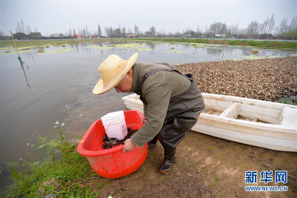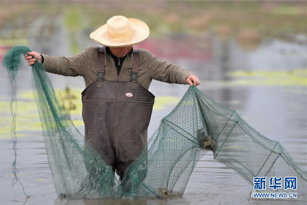 在湖南省南縣一處稻蝦蟹綜合種養基地,農戶在捕收蝦蟹(3月13日攝)。新華社發(陳澤國 攝)
