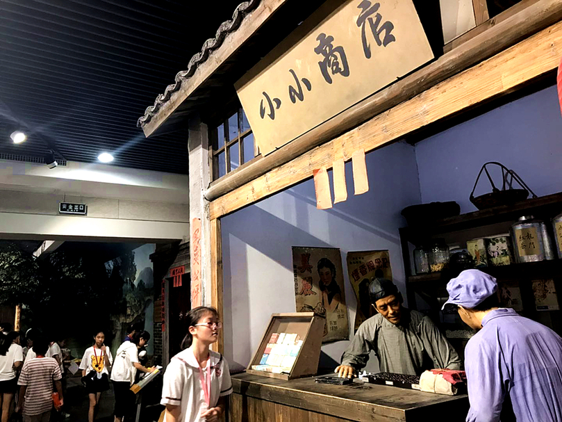6月18日,一名學生在長汀縣博物館內參觀“小小商店”展區。
