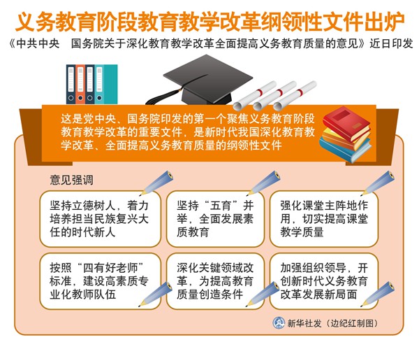 新華社北京7月8日(ri)電(記(ji)者胡浩)《中(zhong)共中(zhong)央(yang)(yang) 國(guo)(guo)務(wu)(wu)院關于(yu)深(shen)化教(jiao)(jiao)(jiao)育(yu)教(jiao)(jiao)(jiao)學改革(ge)(ge)(ge)全面提(ti)高義務(wu)(wu)教(jiao)(jiao)(jiao)育(yu)質量的意見》近日(ri)印發。這是(shi)黨中(zhong)央(yang)(yang)、國(guo)(guo)務(wu)(wu)院印發的第一個聚(ju)焦(jiao)義務(wu)(wu)教(jiao)(jiao)(jiao)育(yu)階段教(jiao)(jiao)(jiao)育(yu)教(jiao)(jiao)(jiao)學改革(ge)(ge)(ge)的重要文件,是(shi)新時代我國(guo)(guo)深(shen)化教(jiao)(jiao)(jiao)育(yu)教(jiao)(jiao)(jiao)學改革(ge)(ge)(ge)、全面提(ti)高義務(wu)(wu)教(jiao)(jiao)(jiao)育(yu)質量的綱領(ling)性文件。