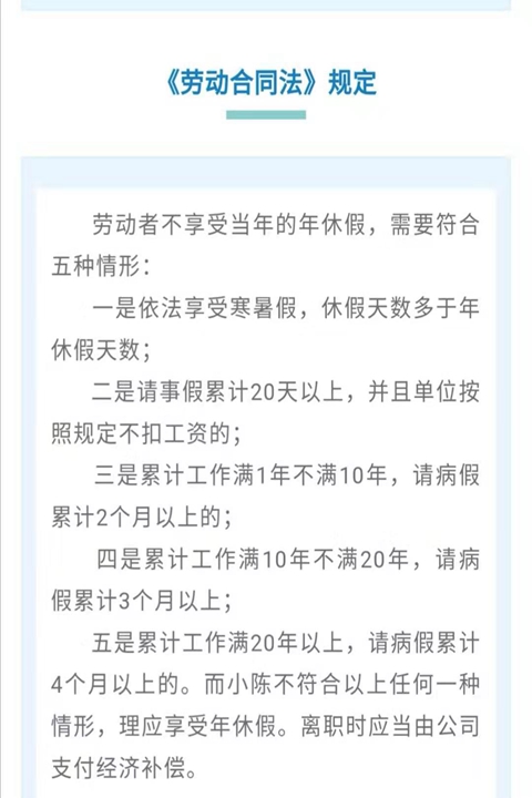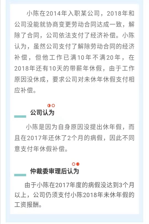 未休年假能要求經濟補償嗎?人社部官方微信2日發布案例,小陳2018年和公司解除了合同,公司依法支付了經濟補償。小陳認為,他工作已滿10年不滿20年,在2018年還有10天的帶薪年休假,由于工作原因沒休成,要求公司對未休年休假支付相應補償。此訴求最終獲得仲裁委支持。(李金磊)