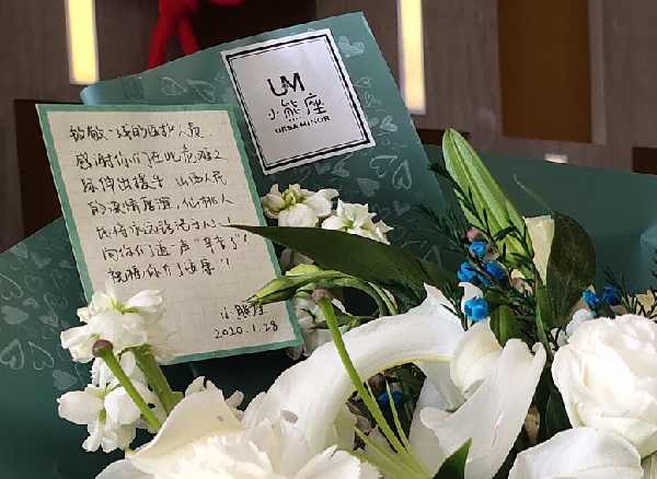 仙桃市民自發送來的鮮花,并在卡片上寫上了“感謝”。