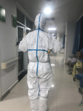 有人問我,為什么都在防護服上寫名字?我想說,這真不是作秀,因為大家都是來自五湖四海,穿上防護服后,根本無法辨認,寫名字是為了方便區別。還有一個重要原因,是患者看到衣服上的名字,需要幫助的時候會喊我們。