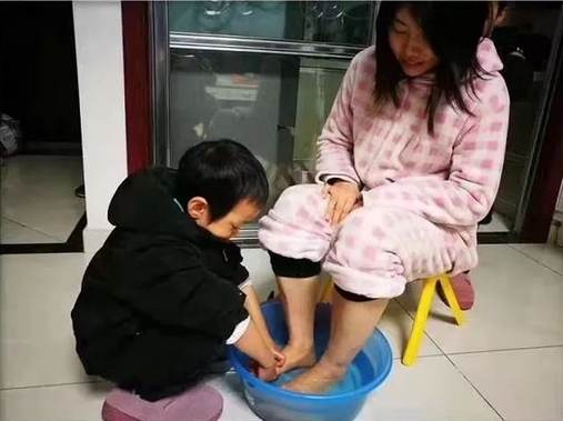 圖為臨行前兒子為媽媽洗腳送行。新華網發