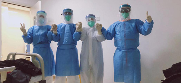 “這就是我們的工作狀態。”費國說,更換補液、指脈氧測量、心率測量……半天下來,體力消耗非常大。盡管工作很辛苦,但照片中的他還是露出燦爛的笑容,可以看出這是一位樂觀的“白衣天使”。