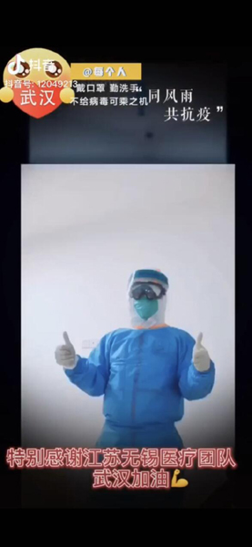 這兩天,一則視頻在網上流傳,視頻發布者是武漢一名正在住院治療中的新型冠狀病毒感染的肺炎患者小陳(化名),而視頻記錄的是奮戰在武漢抗疫一線的3位江蘇無錫醫療隊隊員的工作情景。