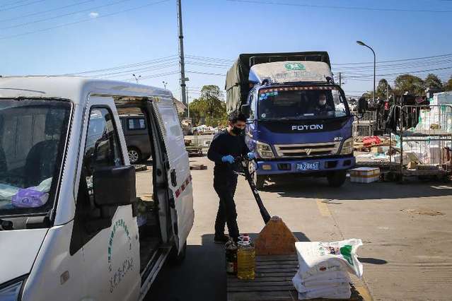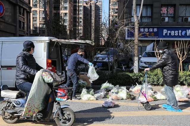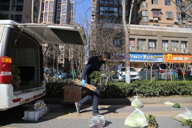 2月16日,湖北省武漢市,送菜小哥許可(中)在卸貨。中青報·中青網記者 趙迪攝