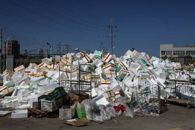 2月16日,湖北省武漢市,美菜武漢六倉外的泡面盒。中青報·中青網記者 趙迪攝