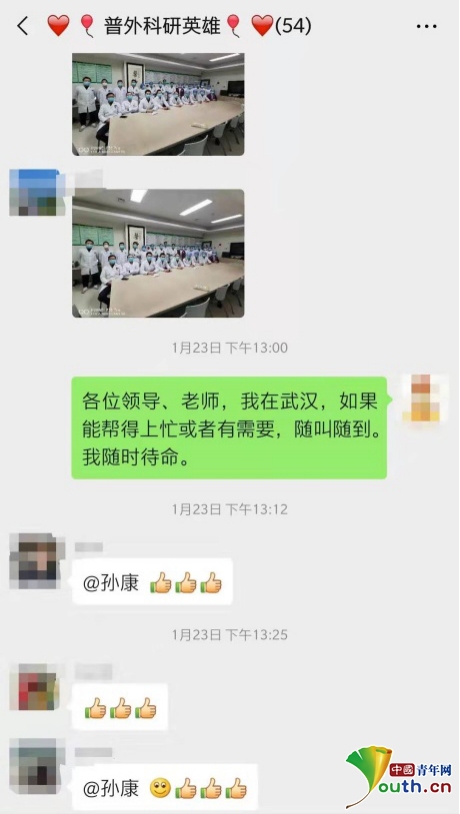 1月23日,看著老師奮戰在抗疫一線,他便主動請求上“戰場”。不過,由于他的專業是外科,因此未被選中。1月24日,孫康在工作群里又得到通知,“醫院可能抽組醫療隊支援地方,進行報名登記”。他便立即二次“請戰”。