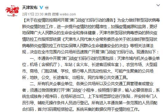 據天津市政府新聞辦微博消息,天津市新型冠狀病毒感染的肺炎疫情防控工作指揮部日前發布通告稱,自2月17日起,天津市域內,凡進入機關企事業單位,機場、車站、商場、學校、銀行等公共場所,乘坐地鐵、公交、出租車等公共交通工具,所有人員須配合掃碼,系統采集的數據僅用于疫情防控工作。