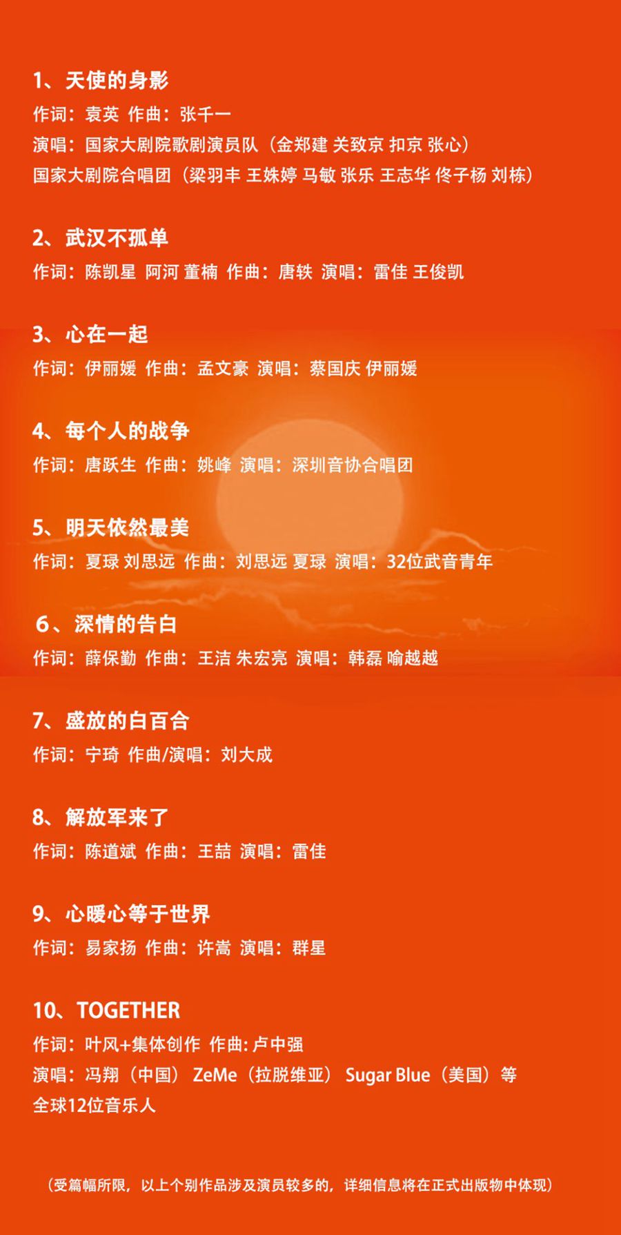 自2月5日起(qi),新華社“聲在中(zhong)(zhong)國”聯合中(zhong)(zhong)宣(xuan)部“學習(xi)強國”平臺、中(zhong)(zhong)唱(chang)集(ji)團旗(qi)下中(zhong)(zhong)國唱(chang)片(上(shang)海(hai))有限公(gong)司(si)共同(tong)推出《情(qing)系武漢 大愛中(zhong)(zhong)國》抗(kang)疫(yi)優(you)秀歌曲(qu)系列全媒體公(gong)益(yi)出版項目,首(shou)(shou)批發布的(de)10首(shou)(shou)抗(kang)擊疫(yi)情(qing)優(you)秀公(gong)益(yi)歌曲(qu)上(shang)線后反響熱烈。