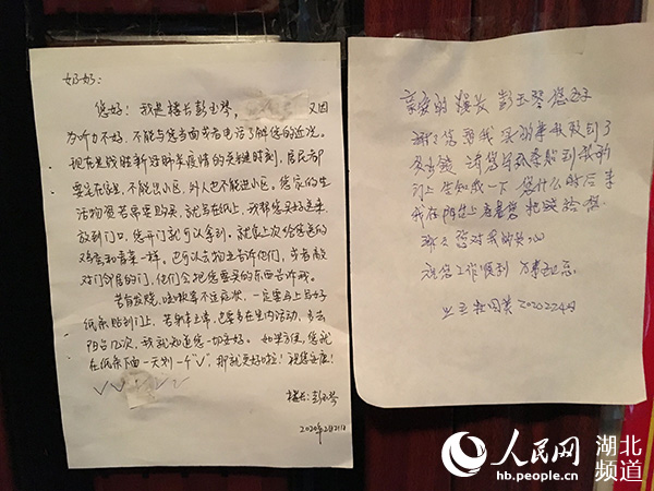 “這是(shi)我送給您的,不(bu)要(yao)錢!” 2月24日下午,湖北(bei)省宜昌市夷陵區小溪塔街道轉崗黨員彭玉琴(qin)來到(dao)金鳳朝陽小區4棟(dong)4樓(lou)的一家(jia)住戶(hu)門(men)前,查看了門(men)邊(bian)留(liu)言條上的內容,掏出(chu)筆寫下了這句溫(wen)馨留(liu)言。