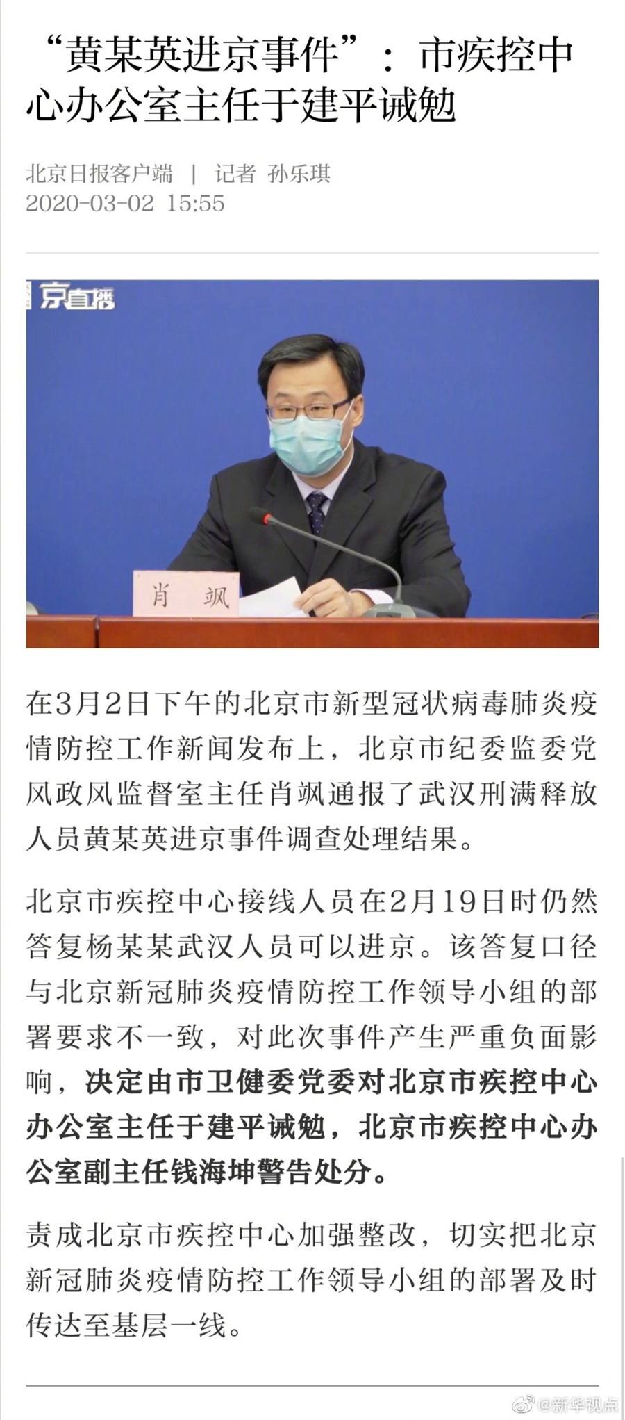 “黃某英進京事件”:北京市疾控中心辦公室主任于建平誡勉-新華網