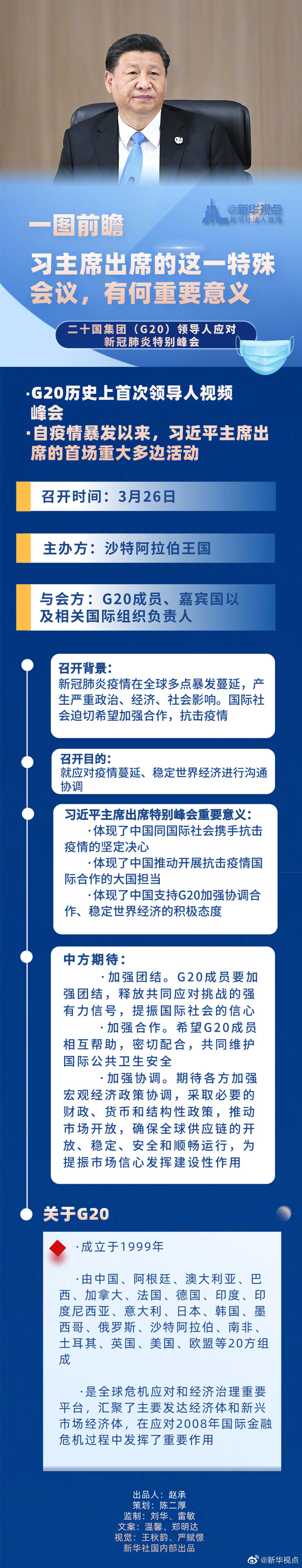 國(guo)家主席習近(jin)平將于3月26日出席二十國(guo)集團領導人應對新冠(guan)肺炎特別峰會(hui),此次峰會(hui)將以視頻(pin)的方式舉行。習近(jin)平主席出席此次特別峰會(hui)有什么重(zhong)要意(yi)義?