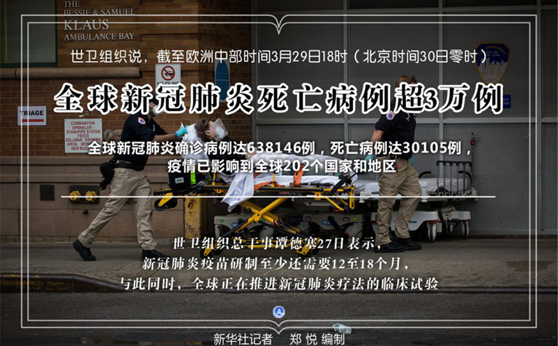 新華社日內瓦3月29日電(記者劉曲)世界衛生組織29日發布的最新數據顯示,全球新冠肺炎死亡病例超3萬例,達到30105例。