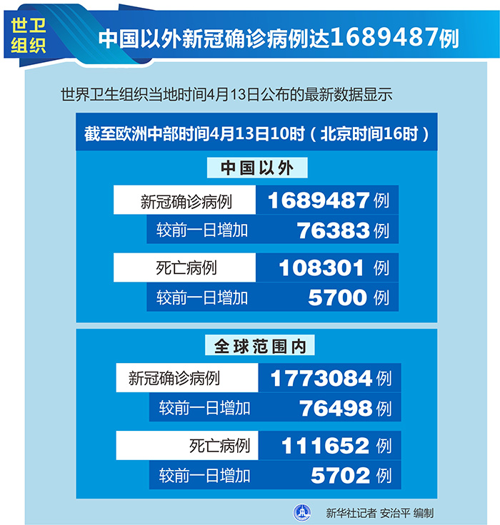 新華社日內瓦4月(yue)13日電(記(ji)者劉曲(qu))世(shi)界衛生組織13日公布的最新數據顯示,中(zhong)國(guo)以外新冠確診病例達到1689487例。