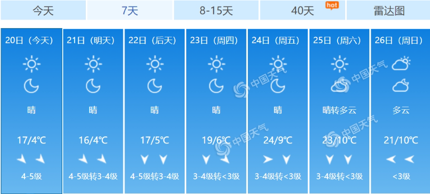 今天,北京依然是北風勁吹的一天,根據市氣象臺今晨6時發布的預報,今天白天,北京晴,北風4~5級(陣風7~8級),最高氣溫17℃;夜間晴,北風4級左右,最低氣溫4℃。