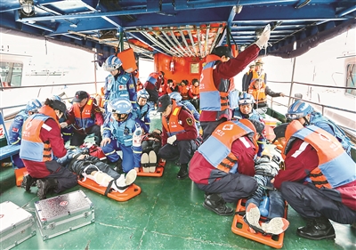 圖為重慶市水上緊急醫學救援隊的救援人員在“事故船”上對傷員進行緊急醫療救援處置演練。新華社記者 劉潺 攝