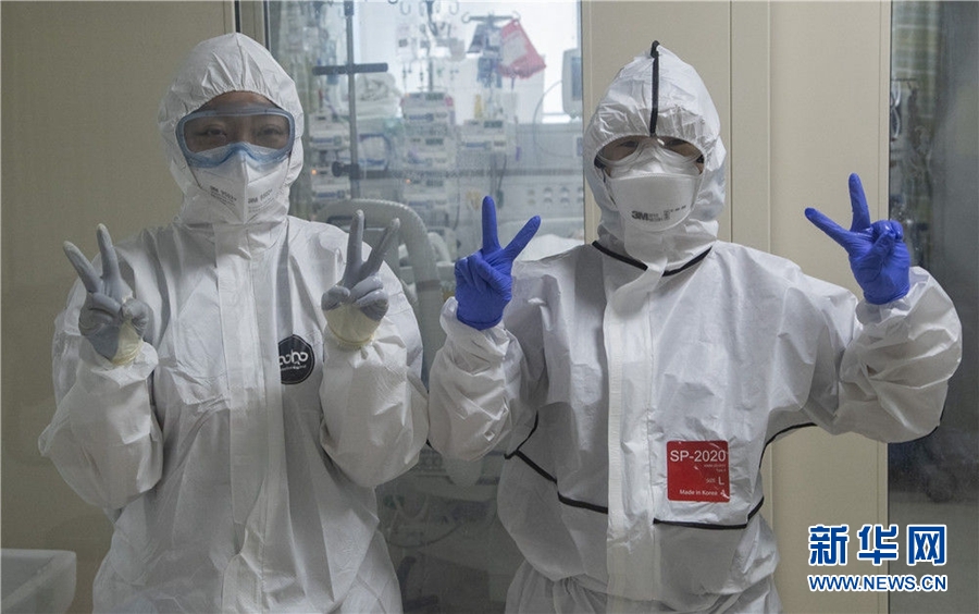 3月18日,在韓國大邱啟明大學東山醫院,醫護人員對記者擺出勝利手勢。新華社發(李相浩攝)