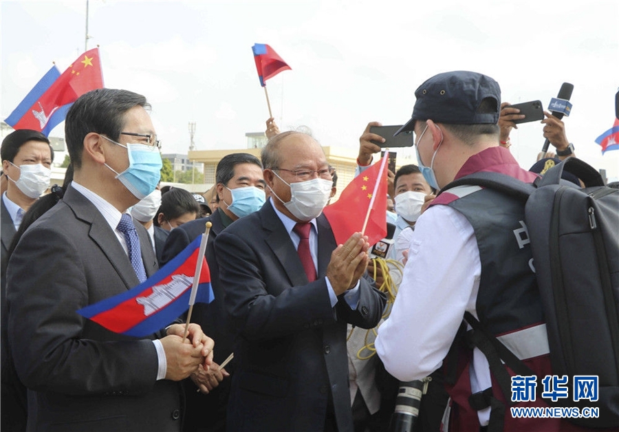 3月23日,在柬埔寨首都金邊,柬埔寨衛生大臣曼本亨(中)在機場迎接中國抗疫醫療專家組。新華社記者 毛鵬飛 攝