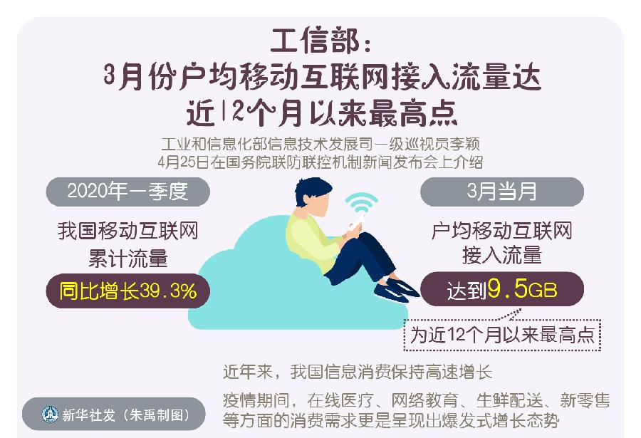 新華社北京4月25日電(記者王希、董瑞豐)今年一季度,我國移動互聯網累計流量同比增長39.3%,3月當月戶均移動互聯網接入流量達到9.5GB,為近12個月以來最高點。