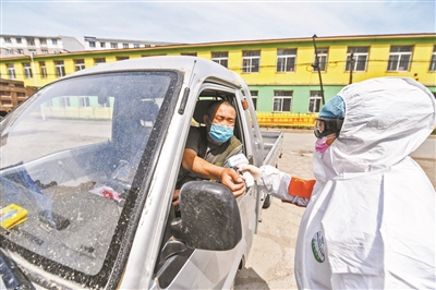 11日,在舒蘭市一小區,工作人員為進出居民測溫