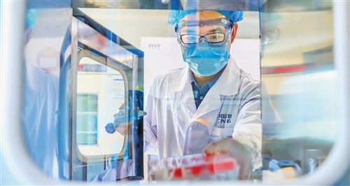 工作人員在國藥集團中國生物新冠疫苗生產基地質量檢定部門從傳遞窗拿取新型冠狀病毒滅活疫苗樣品。 新華社記者 張玉薇攝