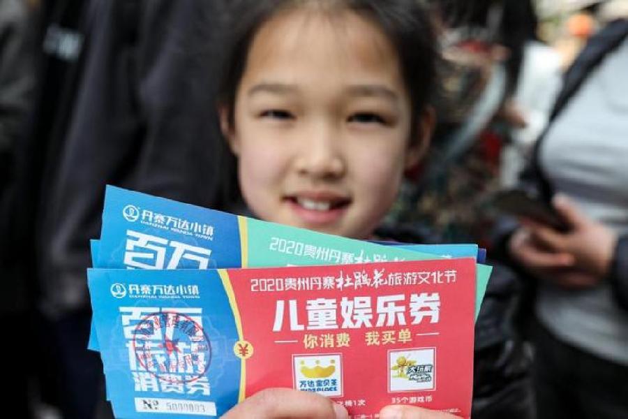 一名兒童在貴州丹寨萬達小鎮展示領取到的旅游消費券 歐東衢 攝