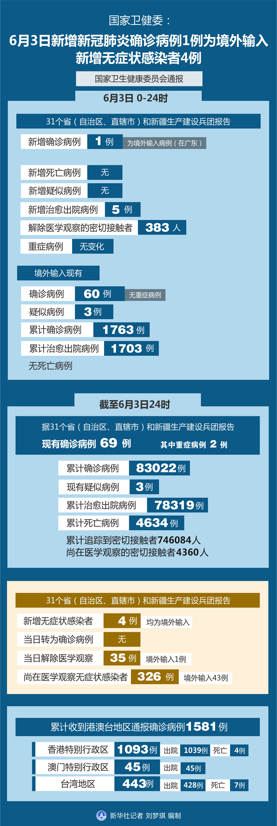 新華社北京6月4日電(記者王琳琳)國家衛健委6月4日通報,6月3日0-24時,31個省(自治區、直轄市)和新疆生產建設兵團報告新增確診病例1例,為境外輸入病例(在廣東);無新增死亡病例;無新增疑似病例。