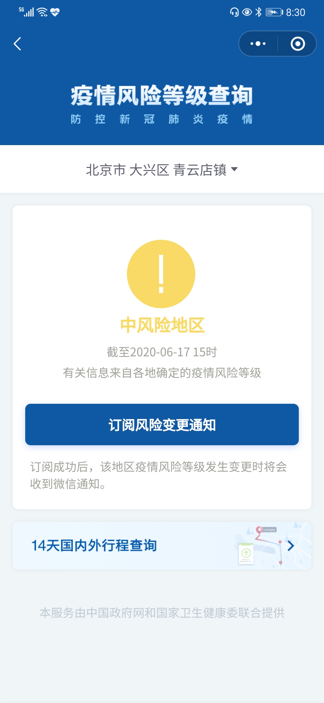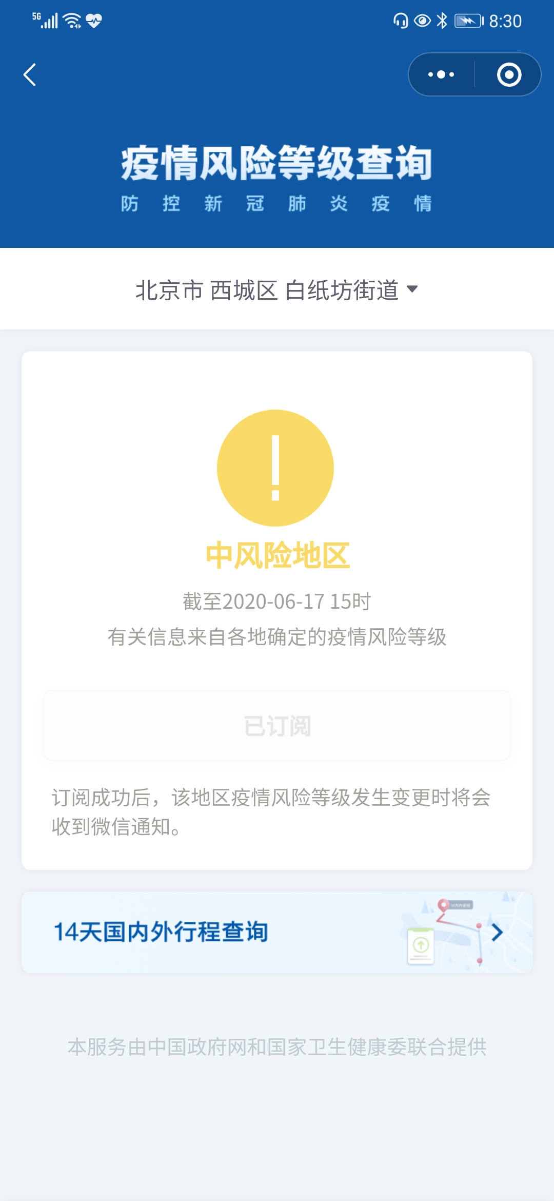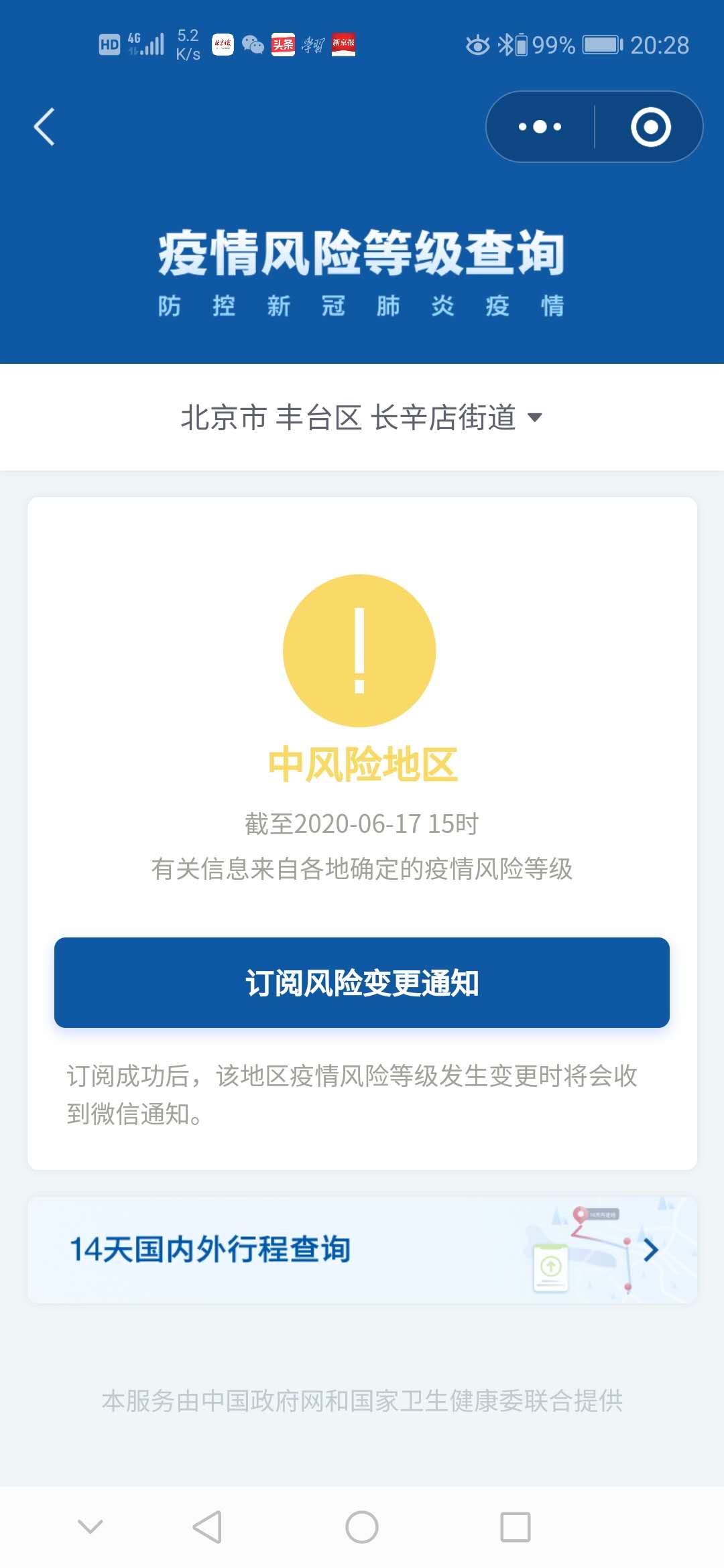 記者從國務院客戶端疫情風險查詢小程序上了解到,截至6月17日15時,北京市又有5個街道升級為中風險地區,分別為東城區和平里街道、北新橋街道,豐臺區長辛店街道,大興區青云店鎮,西城區白紙坊街道。目前,本市已經有32個街鄉鎮升級為中風險地區,另有豐臺花鄉地區為高風險地區,涉及豐臺區、大興區、海淀區、西城區、房山區、東城區、石景山區、朝陽區、門頭溝區9個區。