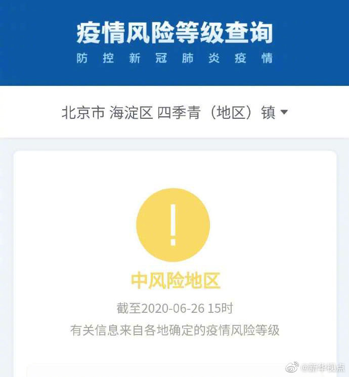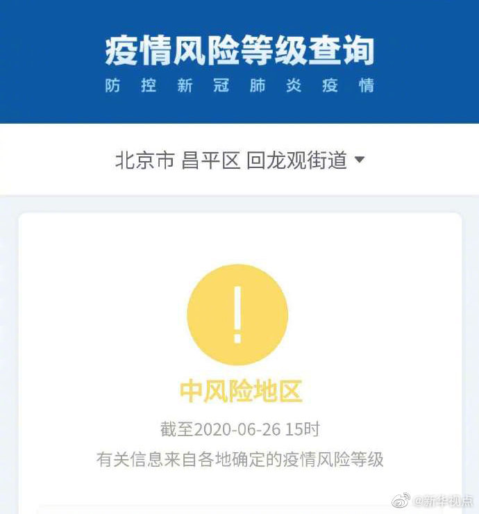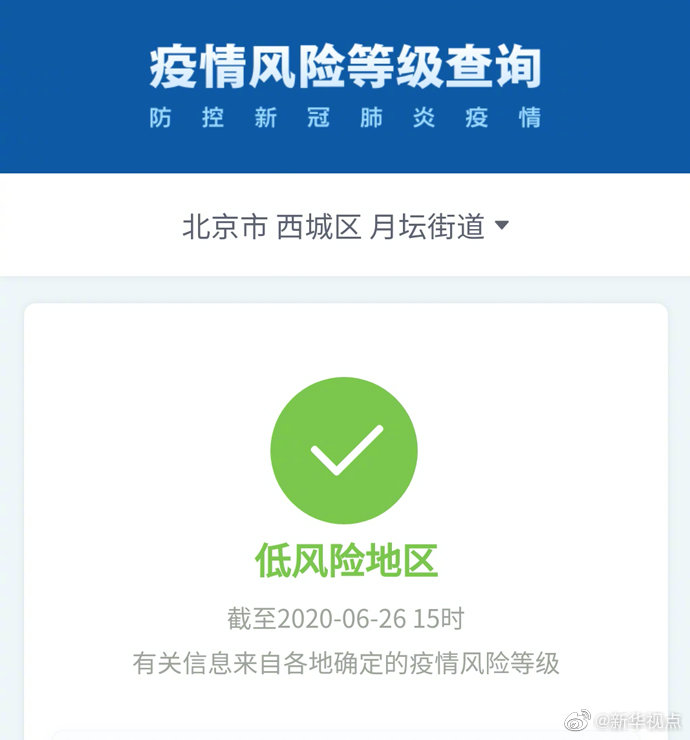 根據國務(wu)院客戶端小(xiao)程序“疫(yi)情風(feng)險等級查(cha)詢”,截至6月(yue)(yue)26日15時(shi),北京市西城區(qu)(qu)月(yue)(yue)壇街道由中風(feng)險地(di)區(qu)(qu)變更為(wei)低(di)風(feng)險地(di)區(qu)(qu)。海淀區(qu)(qu)四季(ji)青(地(di)區(qu)(qu))鎮、昌平區(qu)(qu)回龍觀街道升級為(wei)中風(feng)險地(di)區(qu)(qu)。