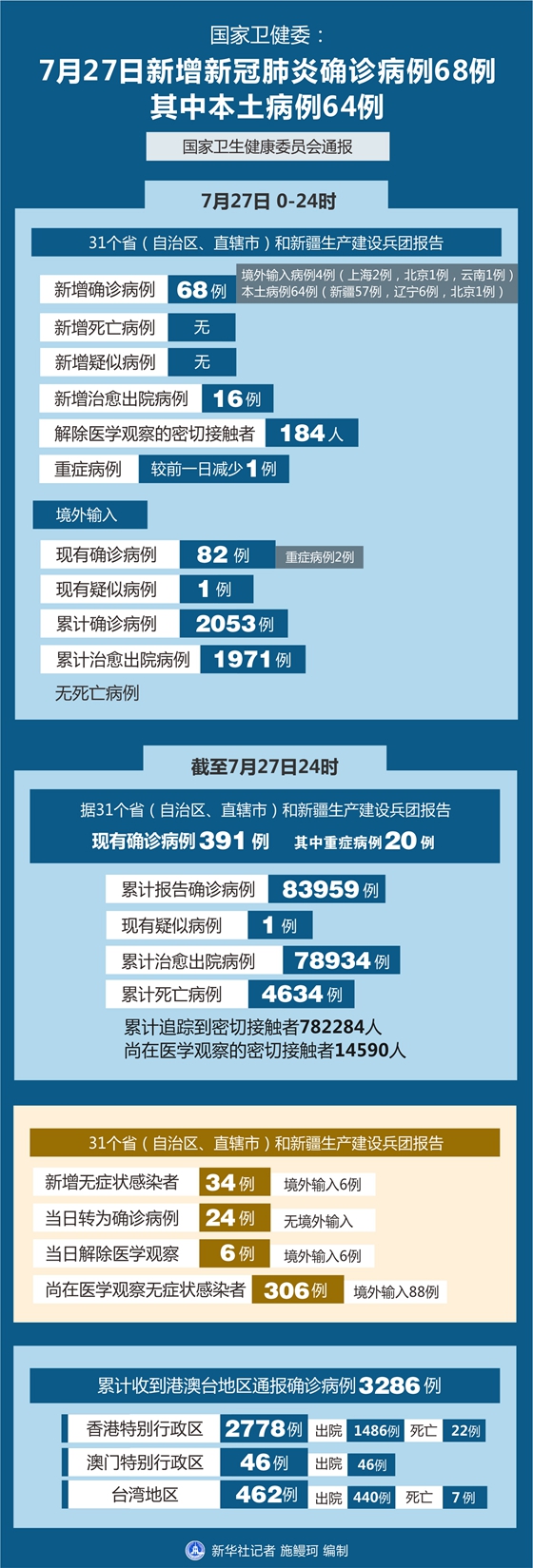 截至7月27日24時,據31個省(自治區、直轄市)和新疆生產建設兵團報告,現有確診病例391例(其中重癥病例20例),累計治愈出院病例78934例,累計死亡病例4634例,累計報告確診病例83959例,現有疑似病例1例。累計追蹤到密切接觸者782284人,尚在醫學觀察的密切接觸者14590人。