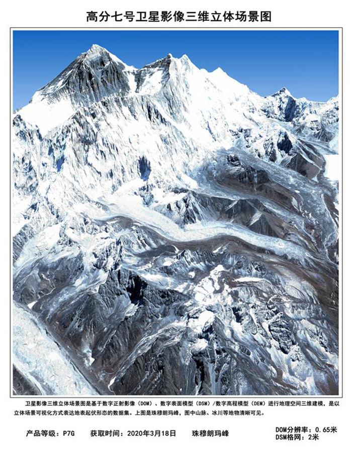 這是高分七號衛星于2020年3月18日獲取的珠穆朗瑪峰三維立體場景圖。? 新華社發(國家航天局提供)