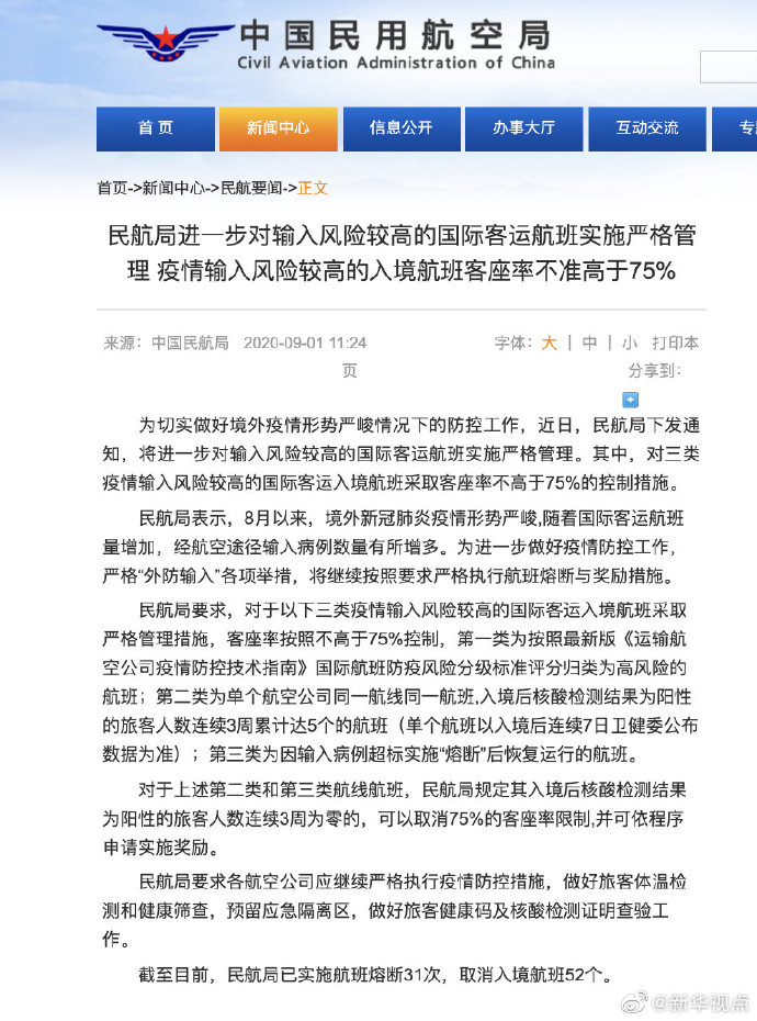 民航局表示,8月以來,境外新冠肺炎疫情形勢嚴峻,隨著國際客運航班量增加,經航空途徑輸入病例數量有所增多。為進一步做好疫情防控工作,嚴格“外防輸入”各項舉措,將繼續按照要求嚴格執行航班熔斷與獎勵措施。