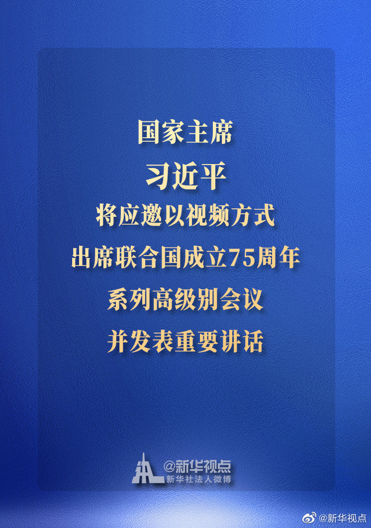 新華社北京9月15日電 外交部發言人華春瑩15日宣布:國家主席習近平將應邀以視頻方式出席聯合國成立75周年系列高級別會議并發表重要講話。