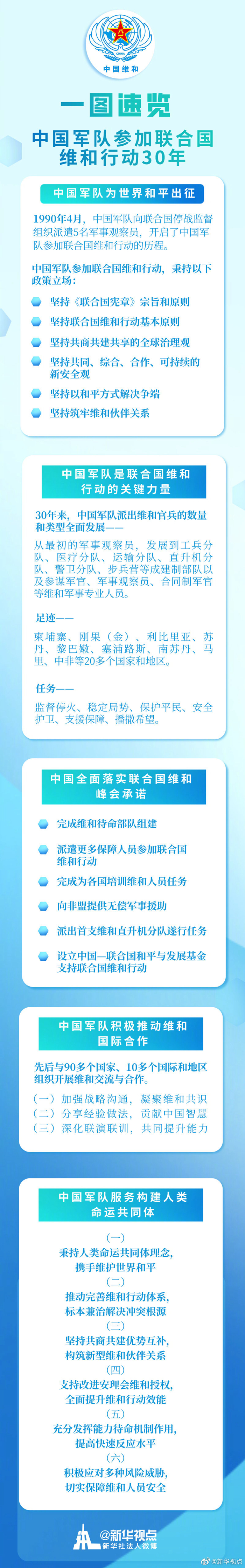 30年來,中國軍隊始終認真踐行《聯合國憲章》宗旨和原則,堅定支持聯合國在維和行動中的主導地位,支持聯合國通過改革構建更加完善的維和行動體系。