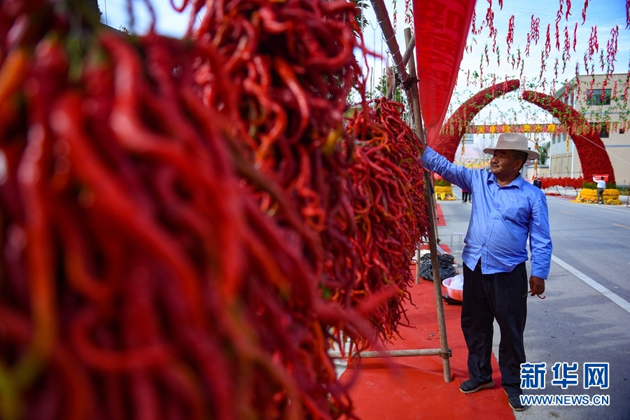 農戶在2020年慶祝中國農民豐收節暨循化縣消費扶貧“辣椒節”現場銷售線辣椒。(新華網潘彬彬 攝)