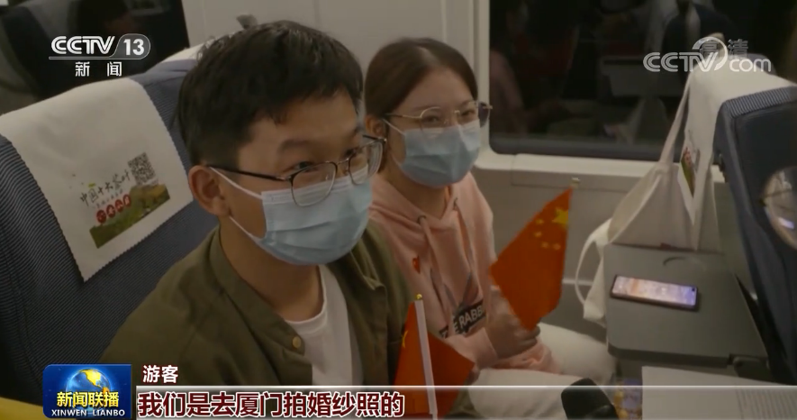 游客:我們是去廈門拍婚紗照的,沿邊的風景都很好看,我們剛才把五星紅旗跟藍天還比著,拍了個照片,每天都讓我們自己有種愛上祖國新的那種感動。