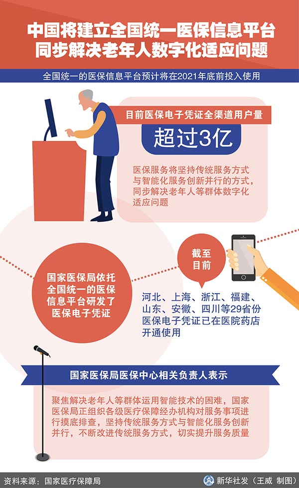 新華社北京11月26日電(記者屈婷)記者從國家醫療保障局了解到,全國統一的醫保信息平臺預計將在2021年底前投入使用,目前醫保電子憑證全渠道用戶量超過3億。同時,醫保服務將堅持傳統服務方式與智能化服務創新并行的方式,同步解決老年人等群體數字化適應問題。