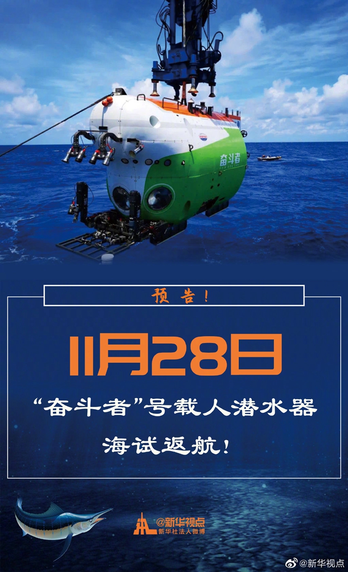 預告!11月28日“奮斗者”號載人潛水器海試返航-新華網