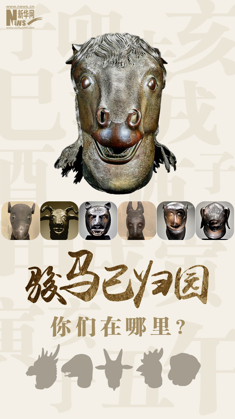 多年來,在國家文物局和社會各界力量的共同努力下,已經有包括牛首、猴首、虎首、豬首、鼠首、兔首、馬首在內的七尊圓明園流失獸首銅像通過不同的方式回歸祖國。截至目前,包括龍首、蛇首、羊首、雞首和狗首在內的五尊獸首仍然下落不明。(海報策劃:王瑩? 制作:王曄)
