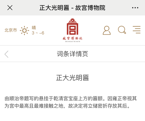“正大光明”匾由順治帝題寫,懸掛于乾清宮寶座上方。因雍正帝視其為宮中最高且最難接觸之地,故決定將立儲密折存放其后。