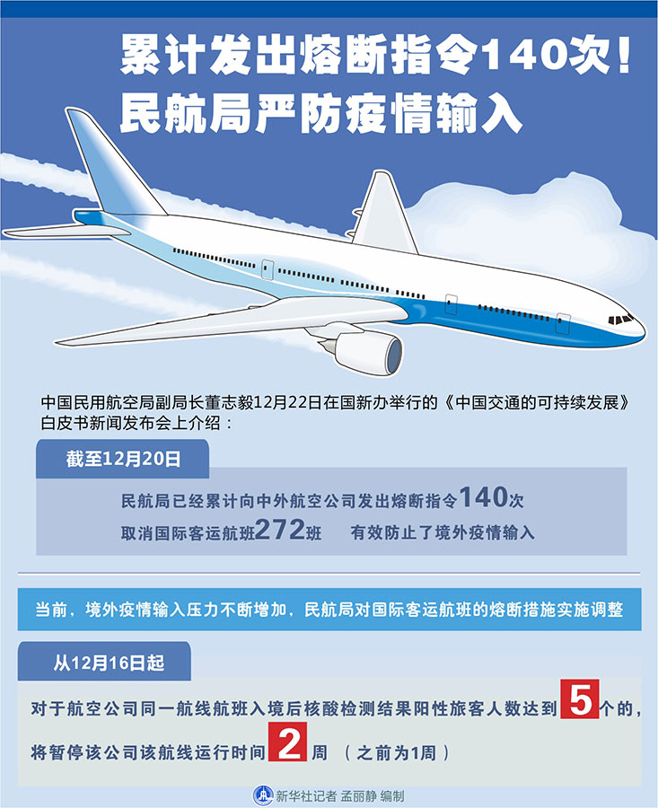 新華社北京12月22日電(記者周圓、魏玉坤)中國民用航空局副局長董志毅22日在國新辦舉行的《中國交通的可持續發展》白皮書新聞發布會上介紹,截至12月20日,民航局已經累計向中外航空公司發出熔斷指令140次,取消國際客運航班272班,有效防止了境外疫情輸入。