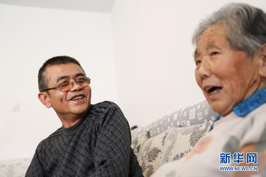 12月18日,西寧市城中區瑞馳社區工作人員張華偉(左)在社區老人管秀容家中,與老人聊天。新華社記者 吳剛 攝