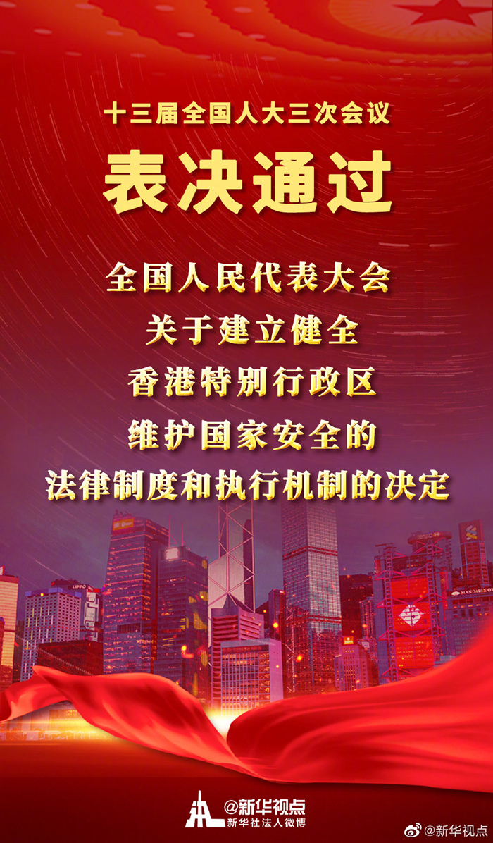 兩會新華社快訊:十三屆全國人大三次會議表決通過了全國人民代表大會關于建立健全香港特別行政區維護國家安全的法律制度和執行機制的決定。