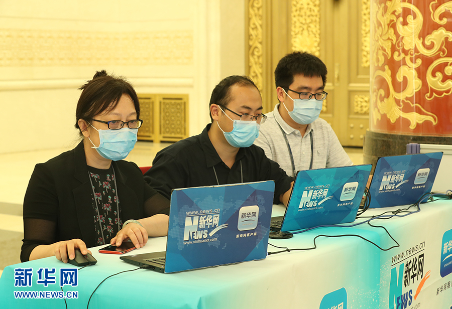 2020年5月28日下午十三屆全國人大三次會議閉幕后,國務院總理李克強在人民大會堂三樓金色大廳出席記者會并回答中外記者提問。為有效防控疫情,共同維護公共衛生與健康,記者會采用網絡視頻形式進行。圖為新華網現場直播團隊。 新華網 王翰林 攝
