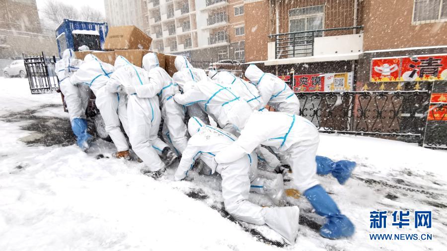 1月6日,大連海洋大學的志愿者們推著滿載的三輪車上坡,將物資送到學生宿舍。新華社發(大連海洋大學供圖)